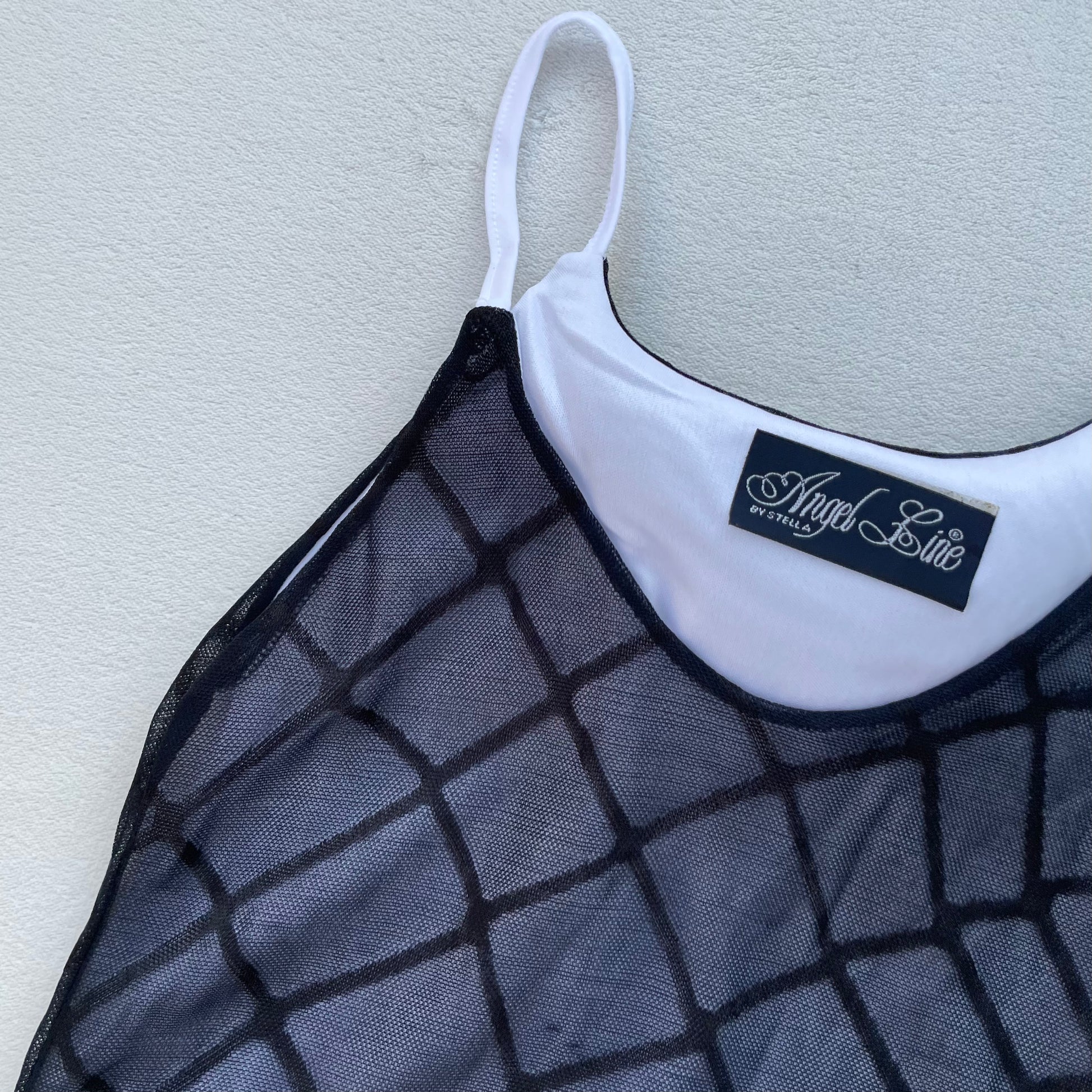 Featuring a sleek white base layer with a black mesh overlay in a geometric crisscross pattern, this top is perfect for layering or wearing on its own for an edgy, modern look.