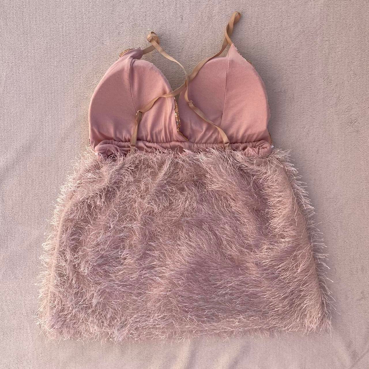 Gold sequin bust top with cute fur details. Has padded cups and adjustable straps